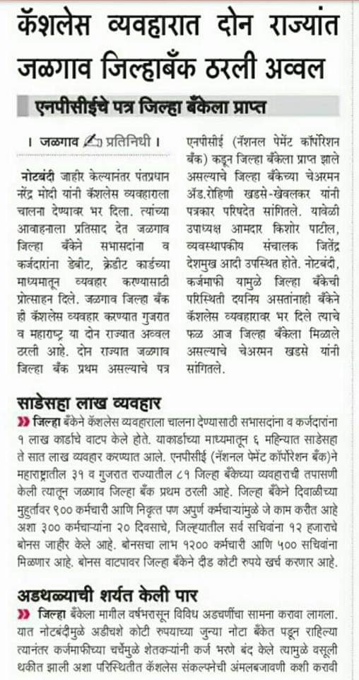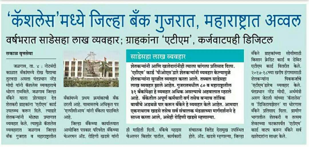 कॅशलेस व्यवहारात दोन राज्यांत जळगाव जिल्हाबँक ठरली अव्वल