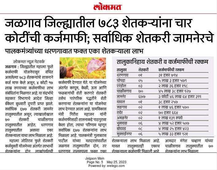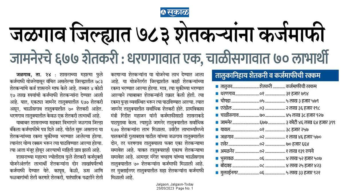 जळगाव जिल्ह्यात ७८३ शेतकऱ्यांना कर्जमाफी